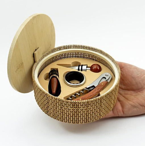 Scatola tonda in bambù con attrezzi da vino. Perfetta anche come idea bomboniera