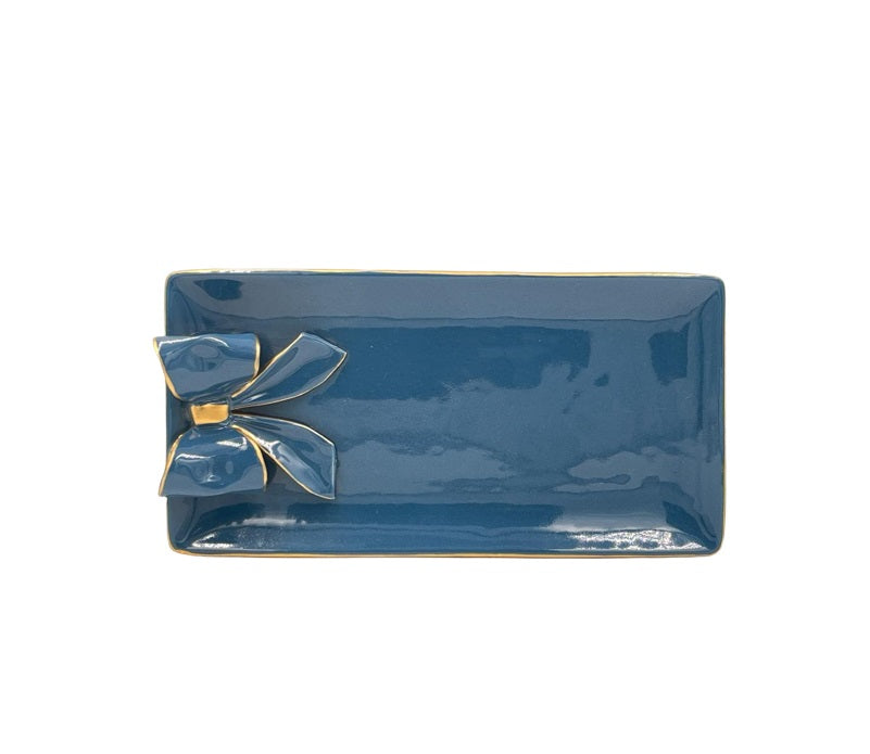 Vassoio rettangolare con fiocco e dettagli oro, realizzato in ceramica di capodimonte. Consigliato come idea regalo o come bomboniera per il vostro evento.