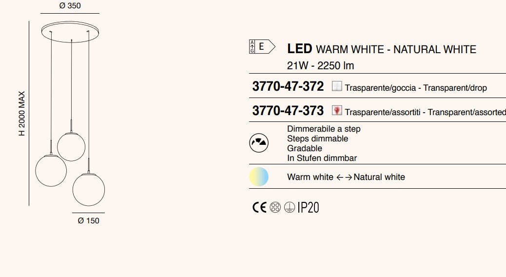 Elegante lampadario a sospensione in metallo e vetro borosilicato trasparente, perfetto se abbinato alla lampada della stessa collezione. Disponibile sia nella variante trasparente con all'interno una goccia, sia con elementi assortiti