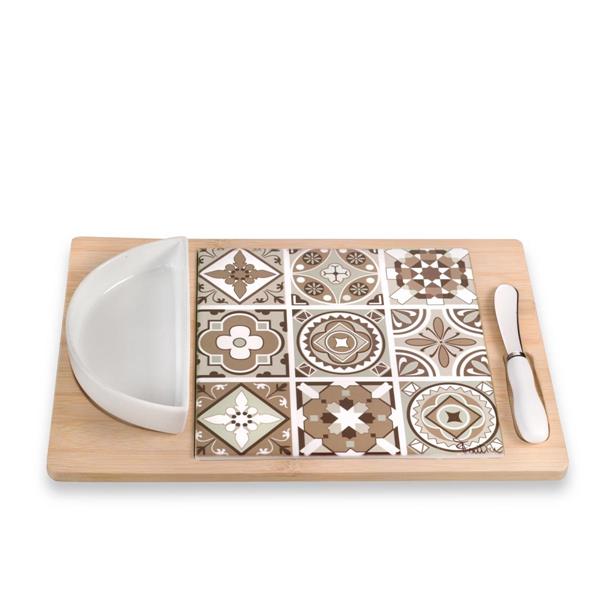 Tagliere con base in legno e ceramica in maiolica tortora con ciotolina aperitivo e coltello per spalmare confetture o creme. 32x22cm. Perfetta come idea bomboniera. Fornita di scatola firmata e confezione.