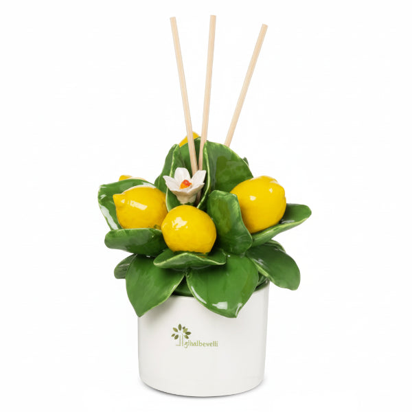 Profumatore in ceramica di Capodimonte con limoni, ø 12 h 13. Fabbricato artigianalmente ed interamente dipinto a mano. Fornito di scatola firmata, profumo e confezione. Perfetta come idea regalo o bomboniera per il tuo evento.