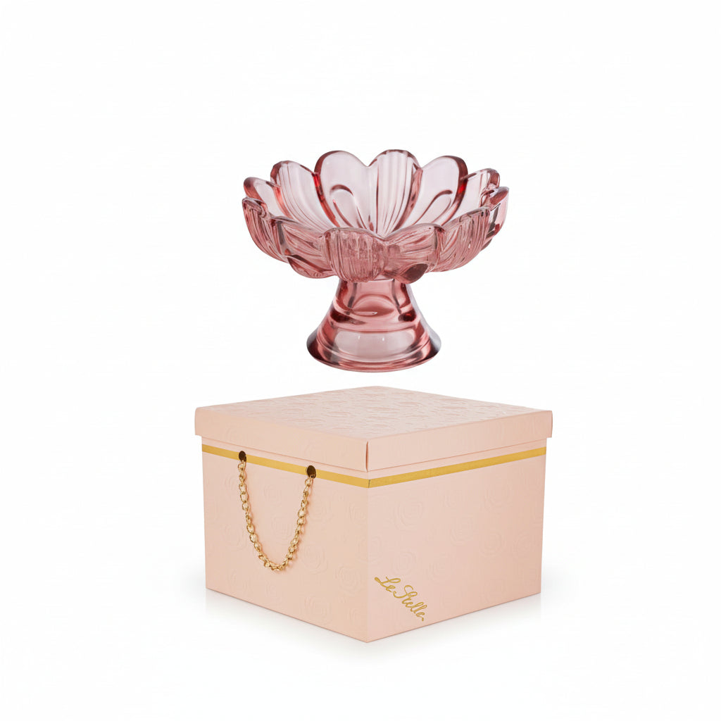 Alzata a forma di fiore porta oggetti in vetro nel colore ciliegia, 14x14x9,5hcm, completo di scatola firmata e confezione. Un'idea originale per rendere il tuo evento indimenticabile.