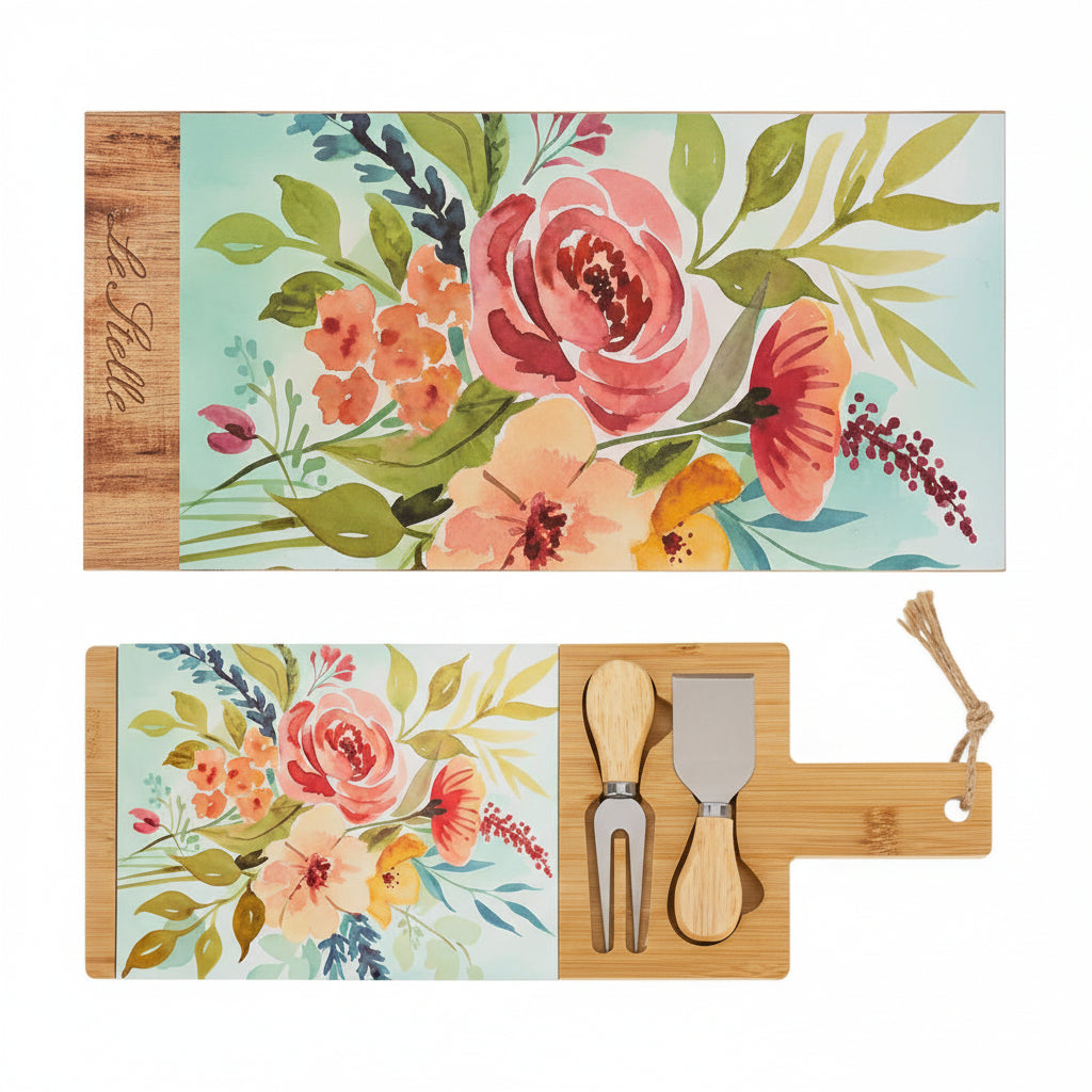 Tagliere rettangolare in legno con 2 posate da formaggio, 15x41cm, completo di scatola firmata e confezione. Un'idea originale per rendere il tuo evento indimenticabile.