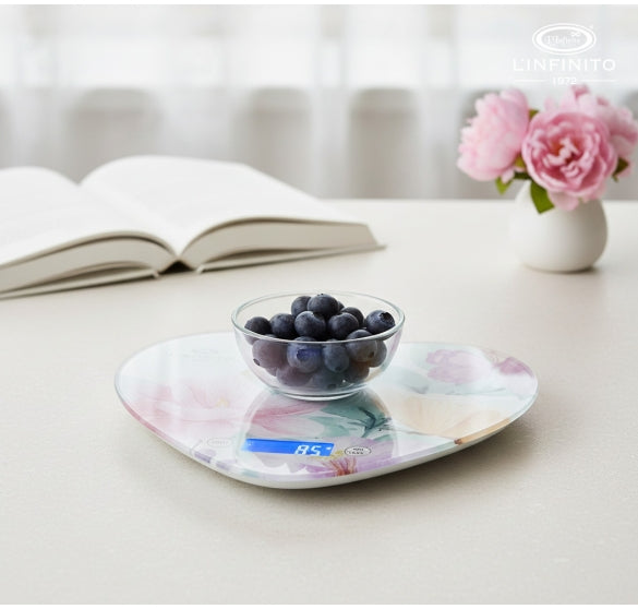 Bilancia elettronica in vetro a forma di cuore con delicato decoro floreale della collezione Fiori Aquarel 2026. Un accessorio funzionale che unisce design romantico e precisione, perfetta per chi ama circondarsi di dettagli ricercati anche in cucina. La confezione a cassetto e la busta regalo con artwork coordinato la rendono ideale come idea regalo elegante e raffinata. Dimensioni: 23,8 × 22 × 2 cm.