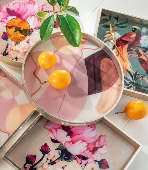 Vassoio tondo in vetro decorato e resina con sofisticato decoro astratto. Un complemento d’arredo versatile che interpreta l’arte dell’ospitalità con gusto contemporaneo. Ø39x4h