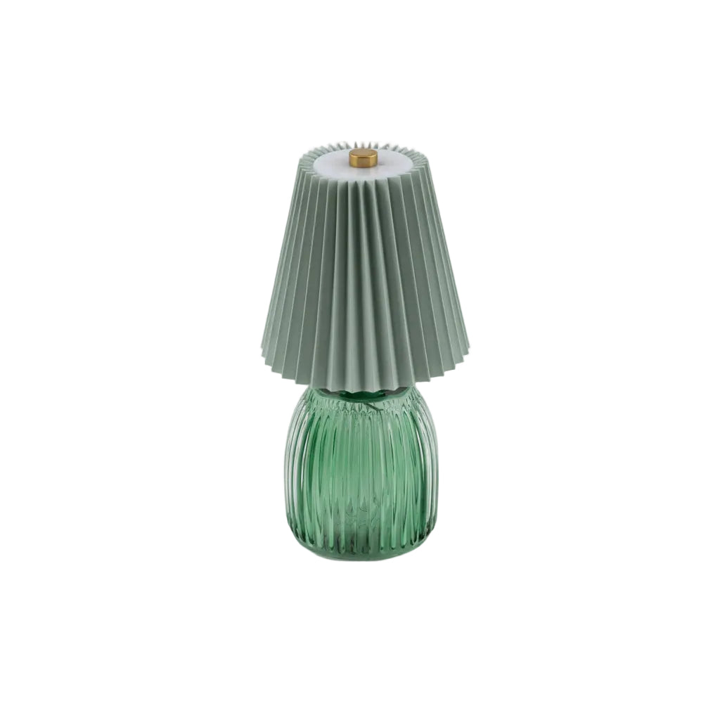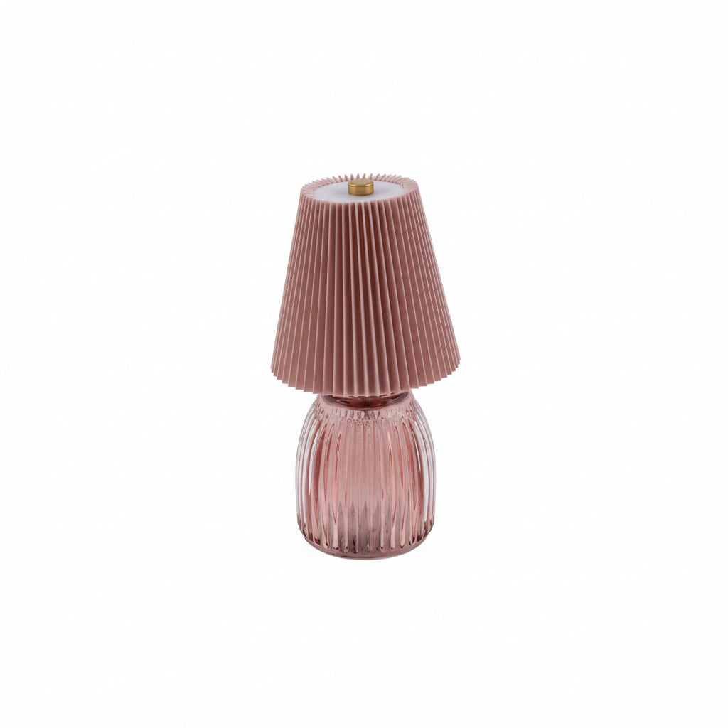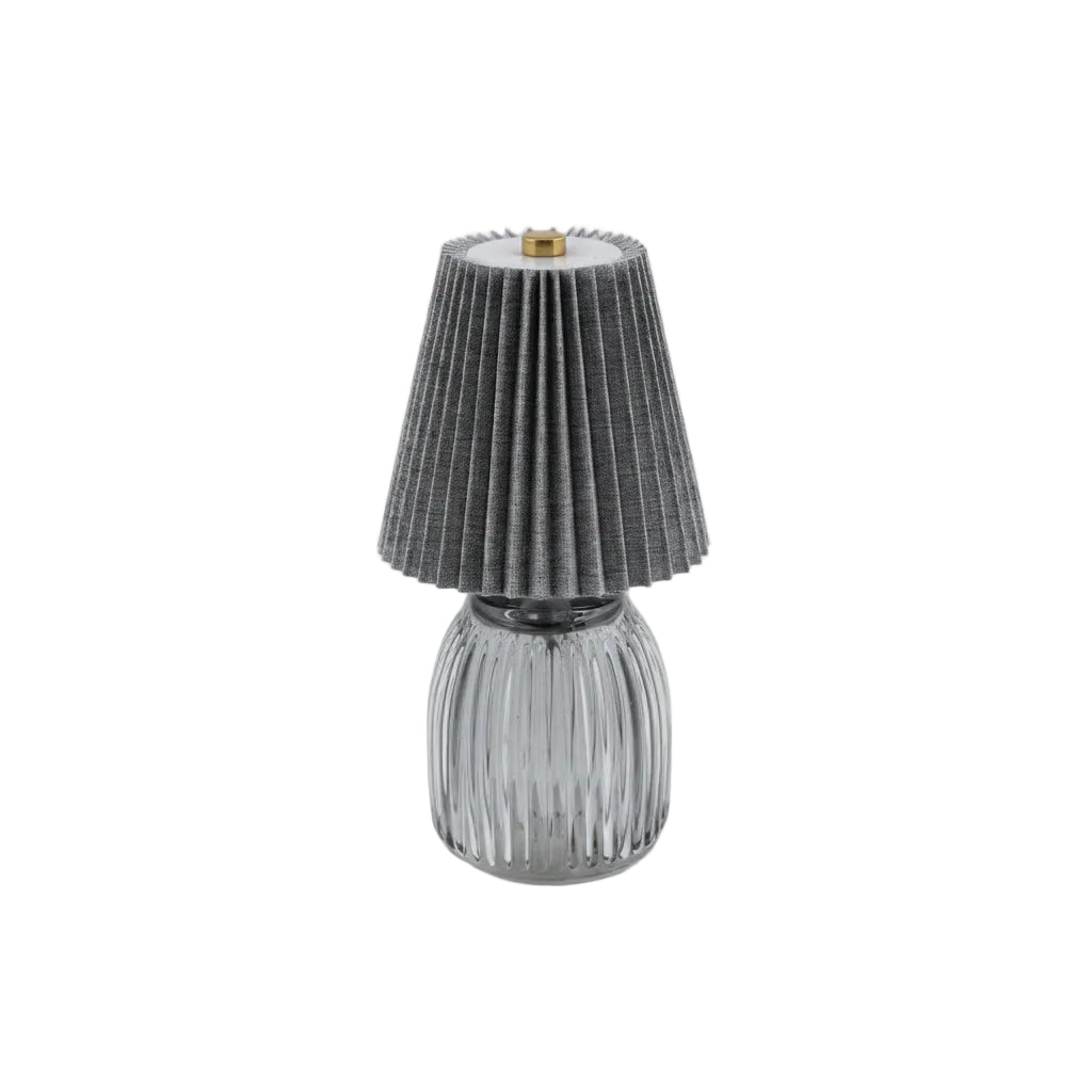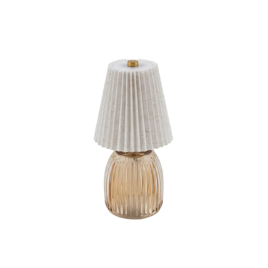 Un equilibrio raffinato tra materia e morbidezza. Il vetro colorato e il paralume tessile regalano una luce intima, ideale per ambienti eleganti e ricchi di stile. Alimentazione a batteria (batteria non compresa). Misure: h21cm. Fornite di scatola e confezione.
