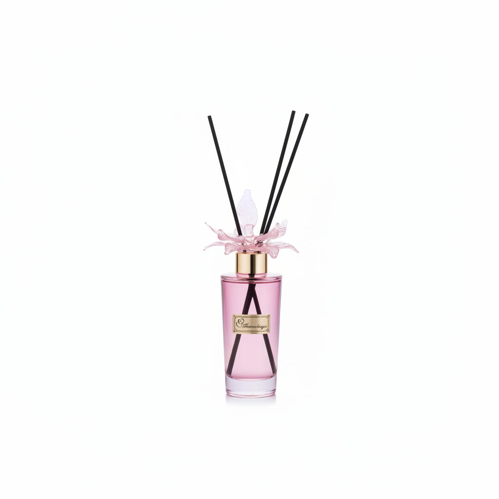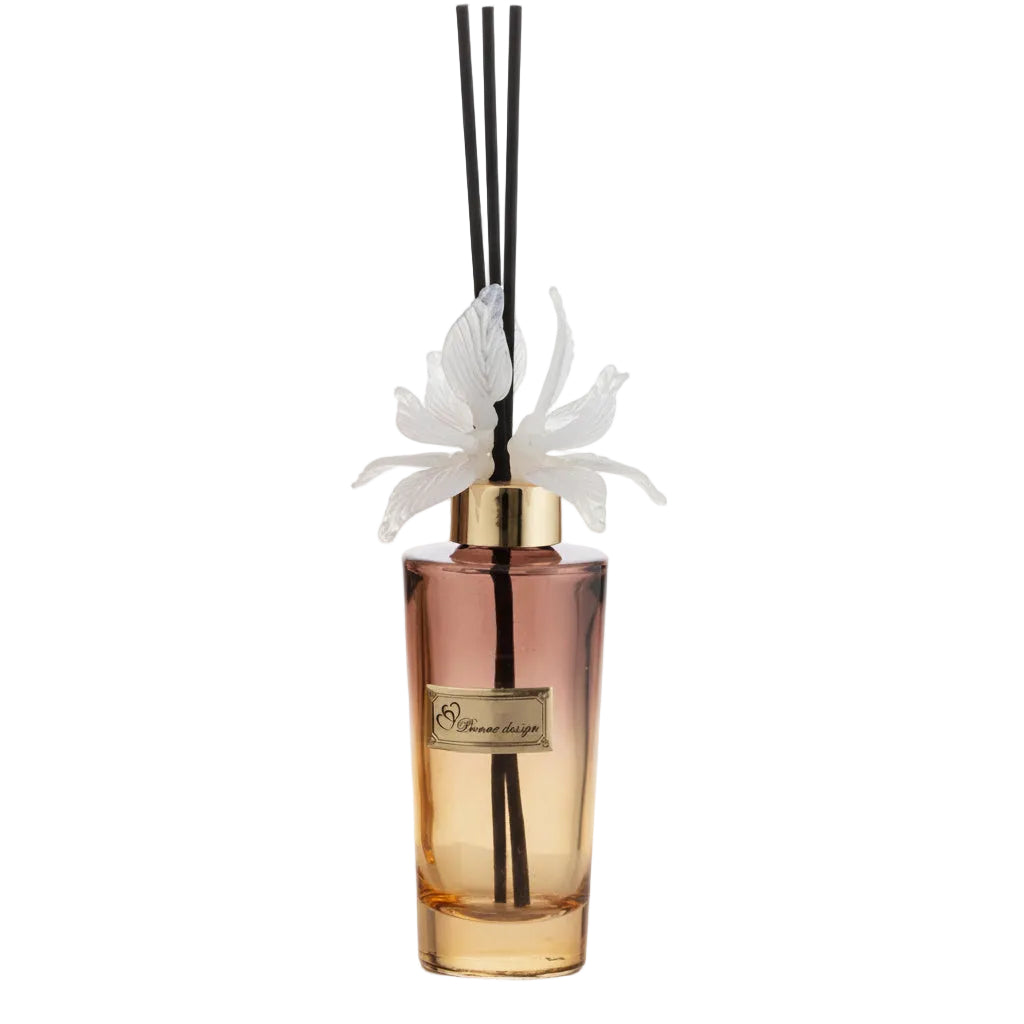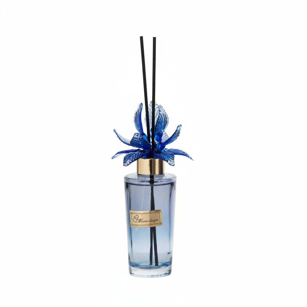 Elegante Bottiglia spargi profumo dalla forma allungata in vetro con dettagli in metallo oro e a chiusura un magnifico fiore in vetro di Murano, h19cm; 100ml, completa di profumo e asticine. Fornita di scatola firmata e confezione.