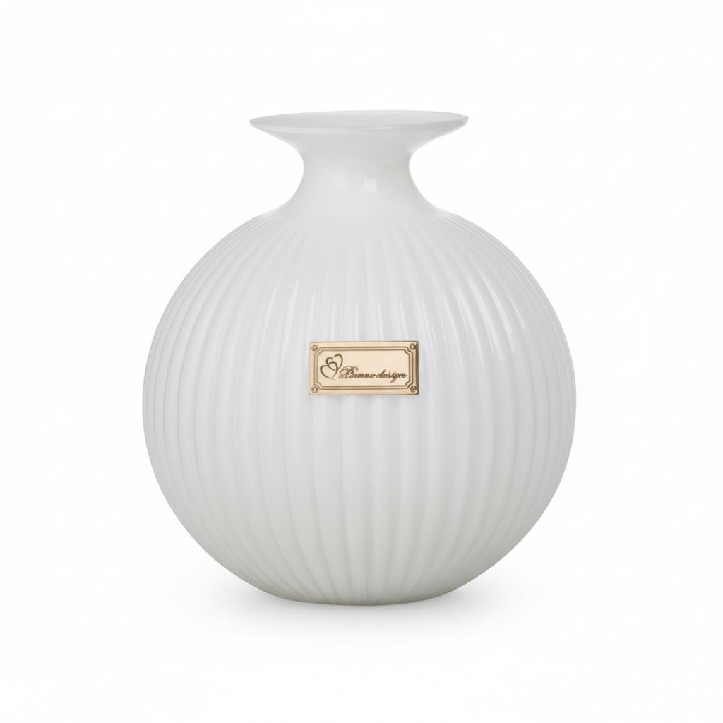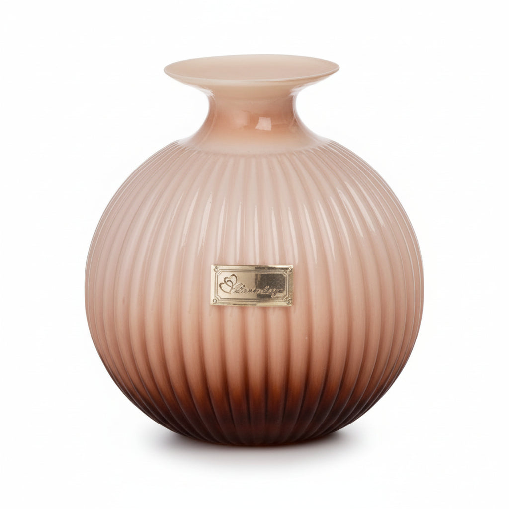 Elegante vaso ampolla in vetro incamiciato con motivi a righe, 16x15cm; Fornita di scatola firmata e confezione.